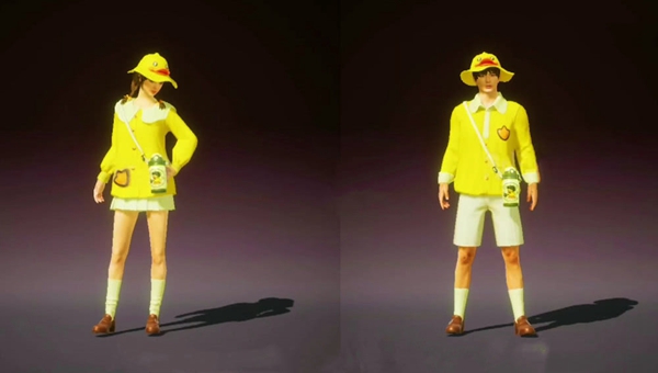 从曝光的衣服上看,小黄鸭本身属于可爱系列的,衣服也是相当的可爱,女性玩家俏皮的圆边衣领显得整个套装格外协调,并携带一个鸭鸭水壶,无疑是在单调中增添了新鲜感,女性角色相比男性看起来会可爱一些,男性玩家们则显得比较“端庄”了。