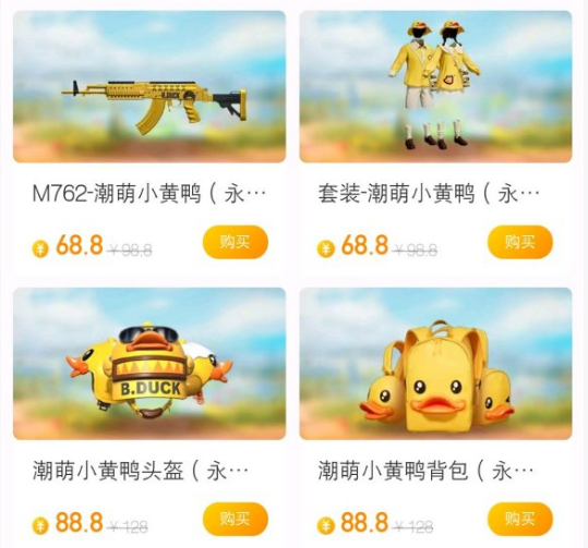 潮萌小黄鸭永久是68.8元、M762小黄鸭皮肤是68.8元、平底锅68.8、头盔3件套88.8元、背包3件套88.8元、降落伞20.8元。
